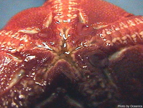 In brittle stars, the opening to the water-vascular system (madreporite) is located in one or more of the oral shields. It is visible here as a small depression within the upper right oral shield.