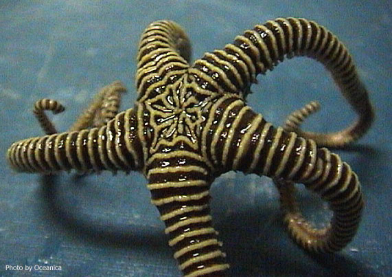 The white rings, or annulations, that give this brittle star the appearance of a striped stocking, are raised ridges bearing microscopic hooks (ref. 2).