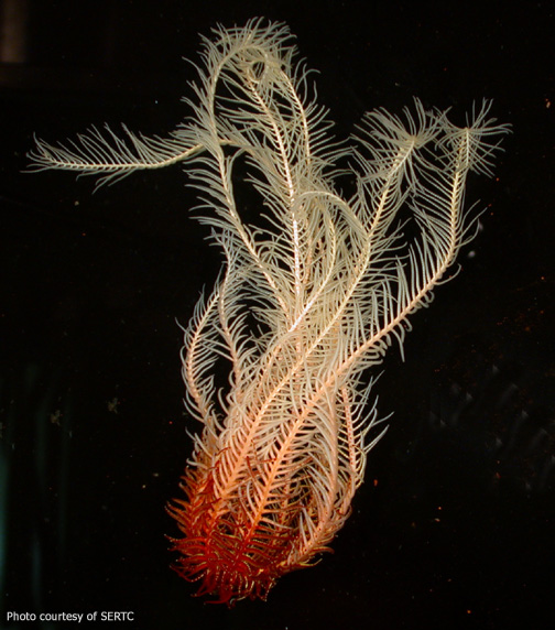 This side view of the second specimen shows the cirri at the crinoid's base, where it attaches to the substrate.