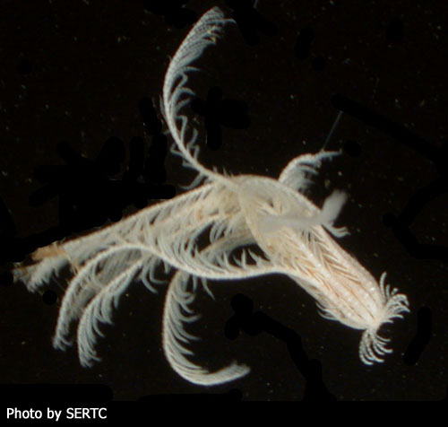 This tiny specimen (< 3 cm in length) is a member of the crinoid Order Comatulida, characterized by having grasping cirri.