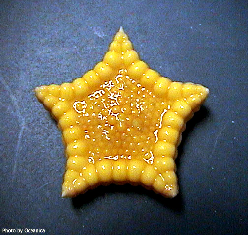 This small specimen shows the prominent abactinal plates along the edge of the aboral side. Smaller rounded plates line the interior.