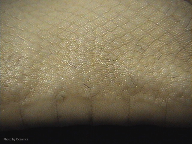 The thin slits in the plates in this oral view are very unusual bivalved or clamshell pedicellariae, a highly modified protective structure. They are found on nearly all surfaces of the starfish.