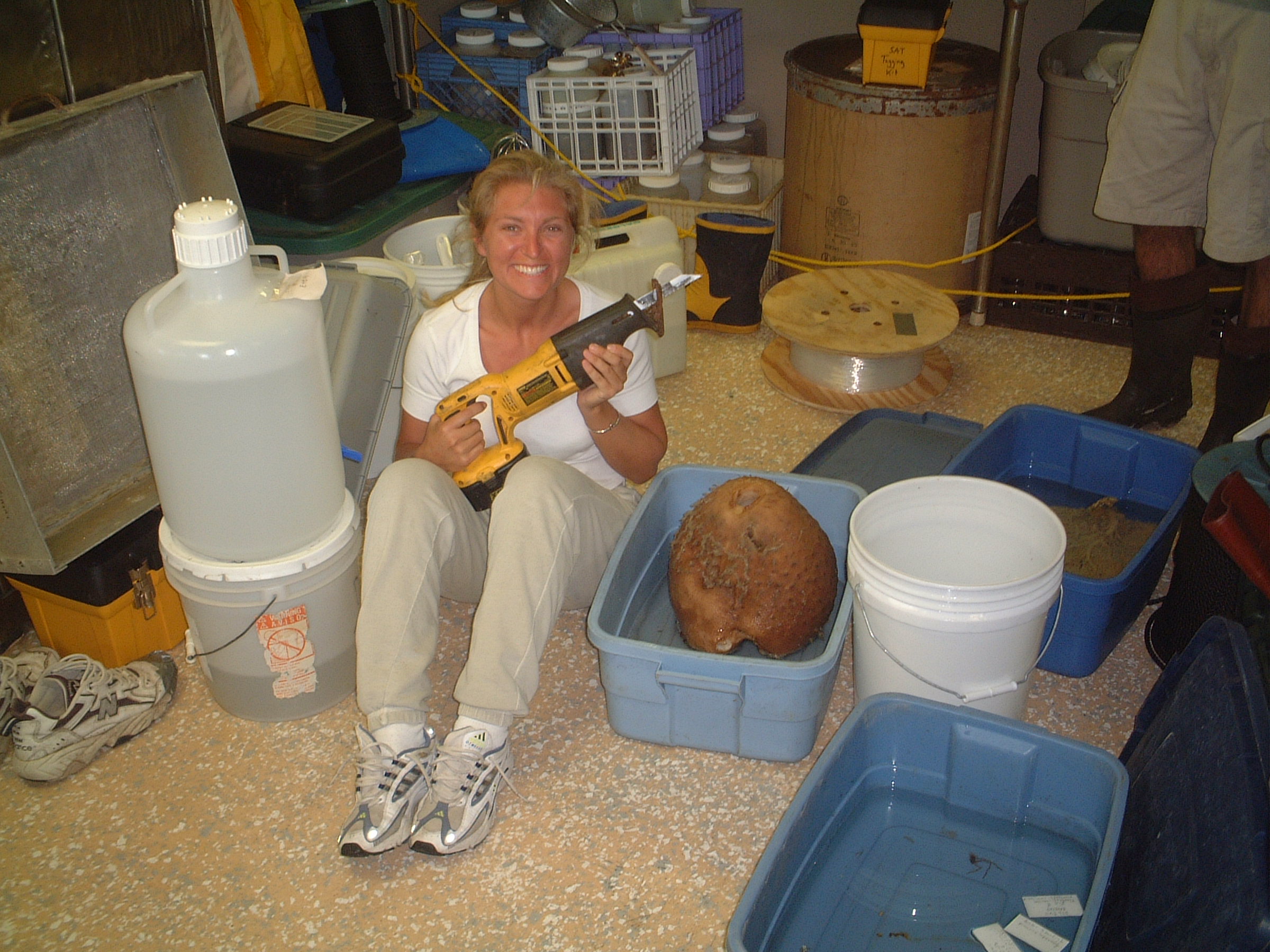 Susan Thornton-DeVictor prepares to saw through the large (and very tough!) sponge collected during a submersible dive. The sponge will be studied for the organisms that live within it.