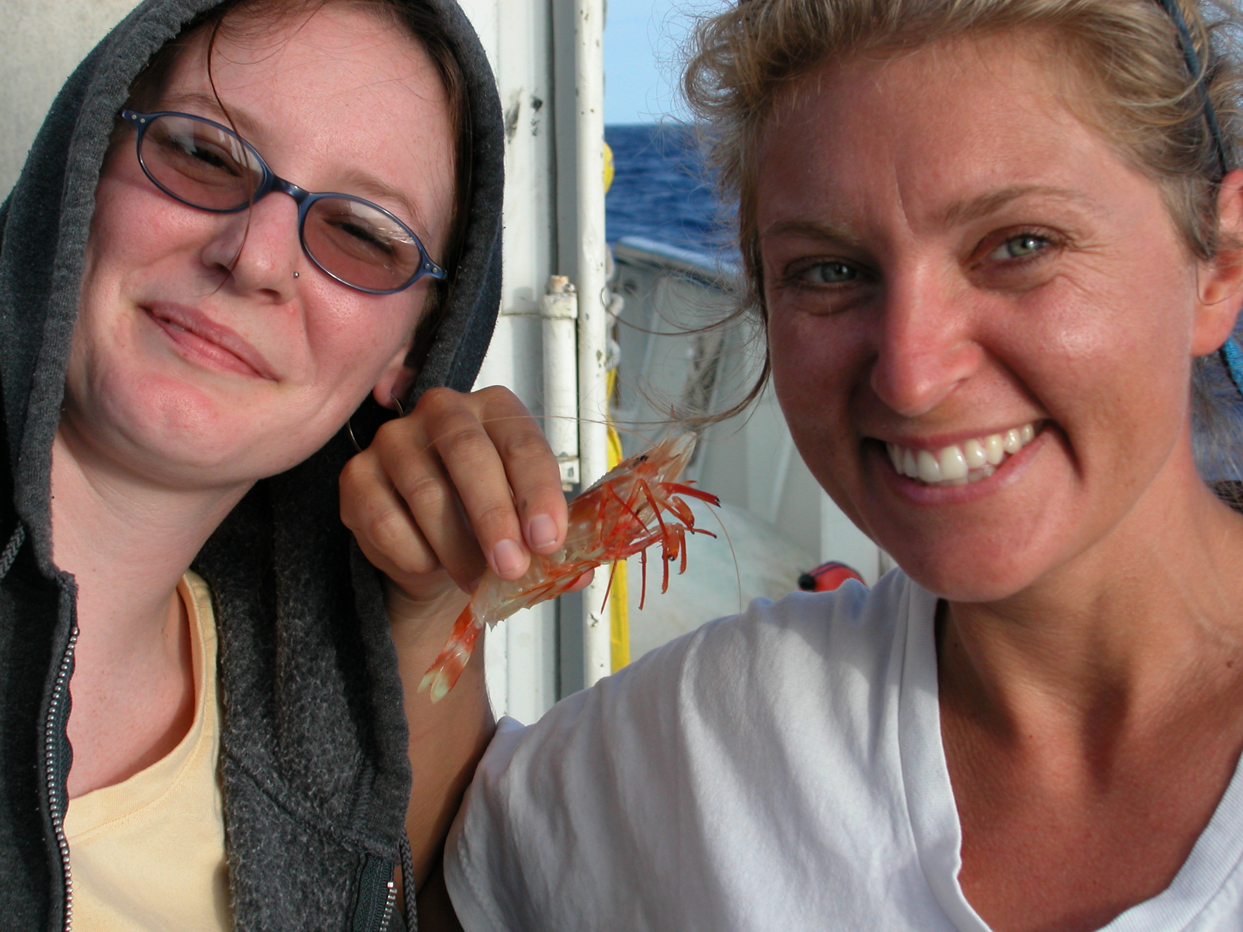 Denise Strickland (left) and Susan Thornton-DeVictor showcase one of the large shrimp specimens collected in a carrion bucket.
