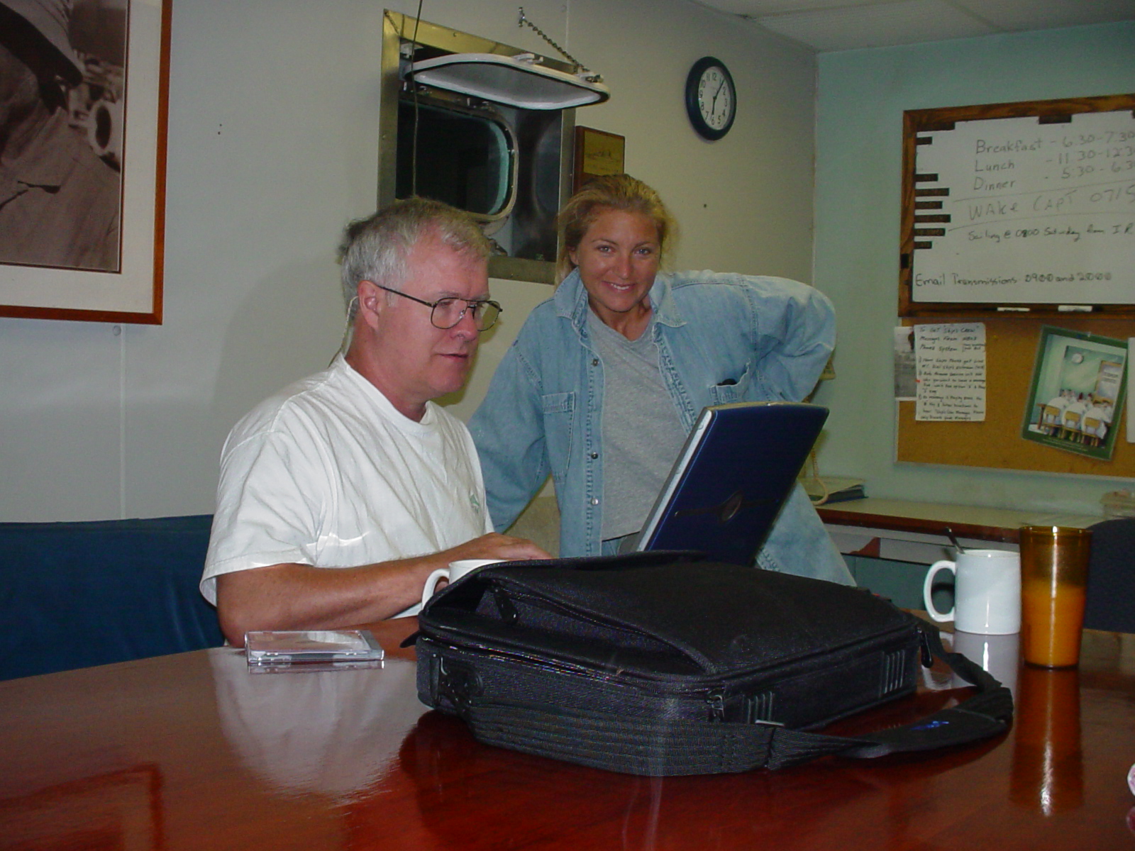 Jerry McLelland (left) and Susan Thornton-DeVictor work on some of the data logging at the end of their watch (6 AM!).