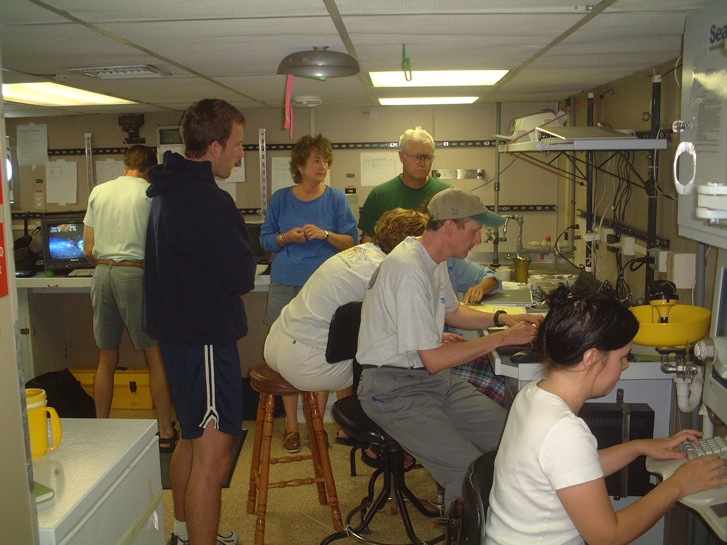 After each dive, the scientists gather around the video player (not shown in photo) to examine what was viewed from the submersible.
