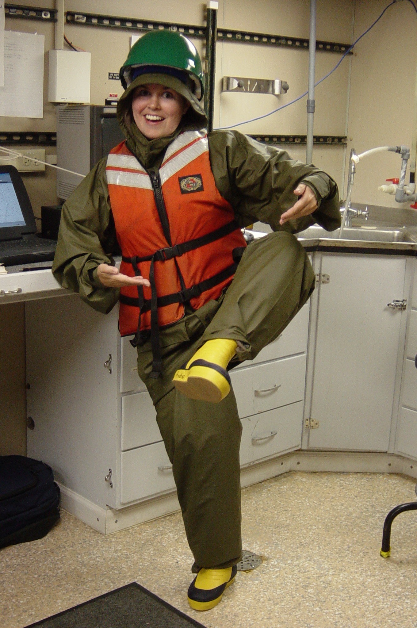 Dara Hooker models her gear for deploying the CTD during less-than-perfect weather.