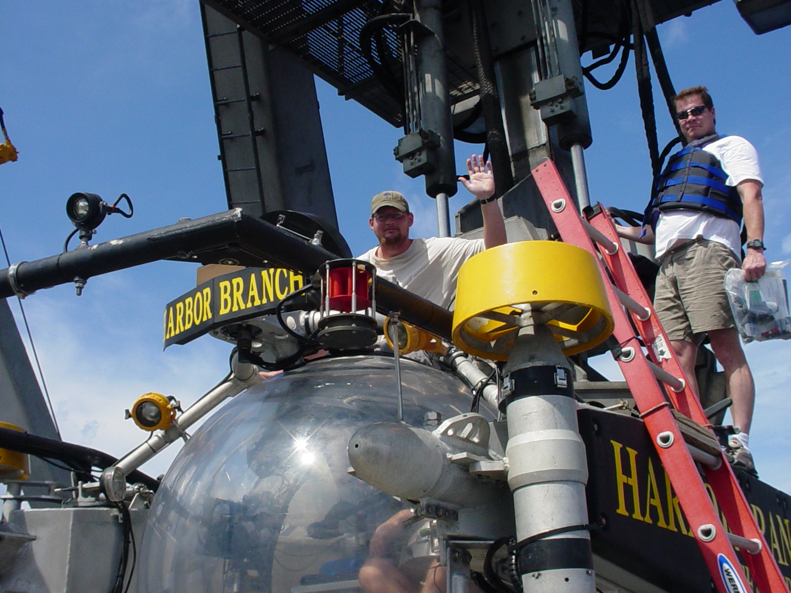 Josh Loefer enters the Johnson Sea-Link's acrylic sphere, preparing for his dive to 1700 ft.