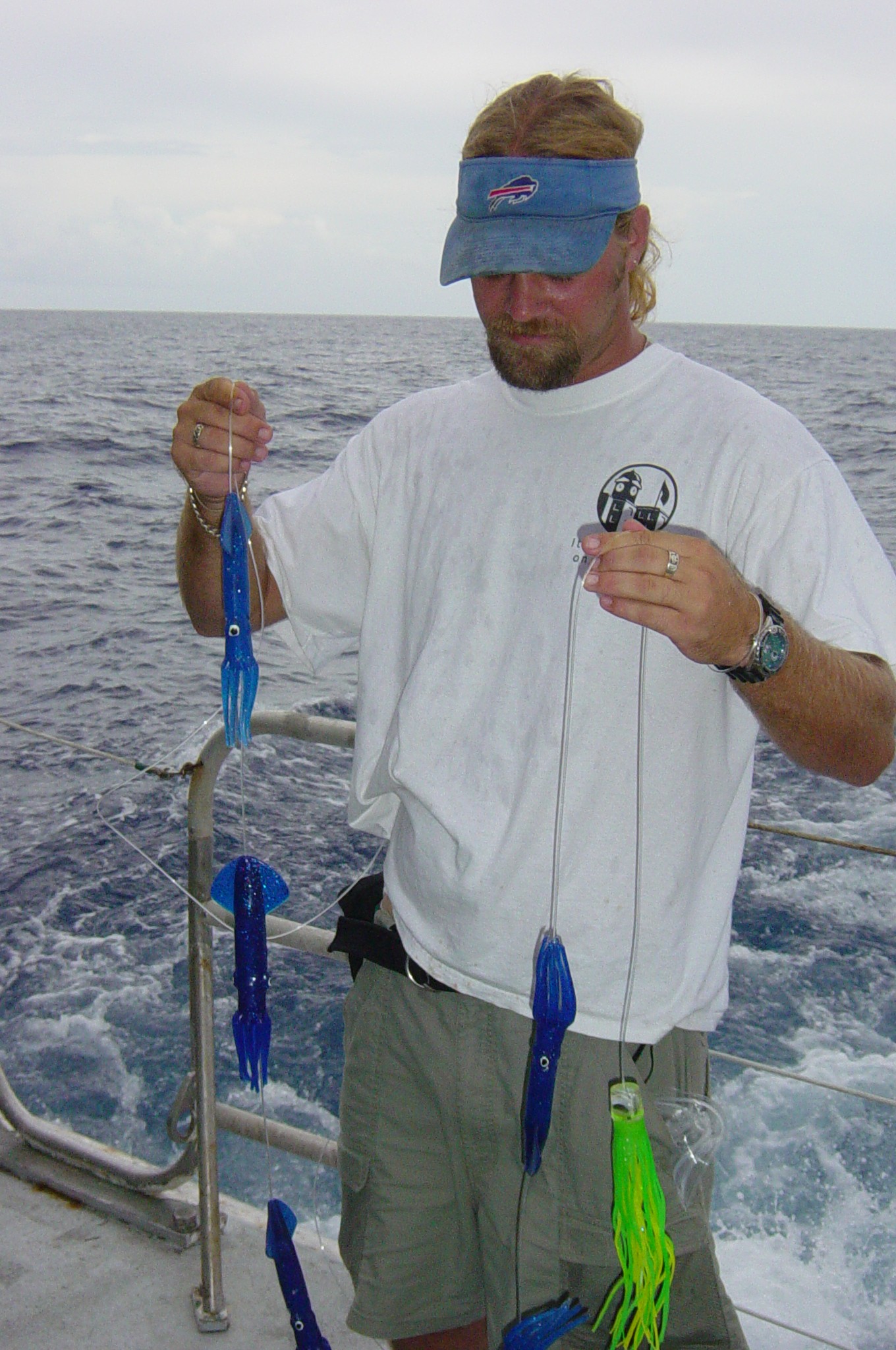 Phil Weinbach displays the "teaser squid" that are deployed behind the ship to attract large fish, as part of the billfish tagging project.