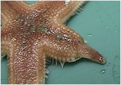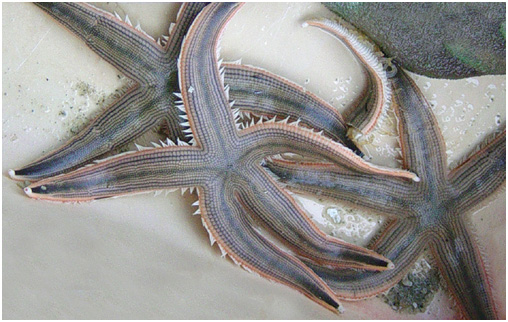 Right: Pointed tube feet (without suckers) are shown extending from the ambulacral
