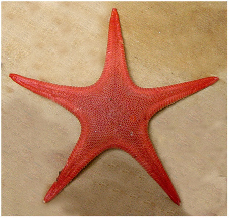 Interradial plates are salmon color, with darker spines near the ambulacral