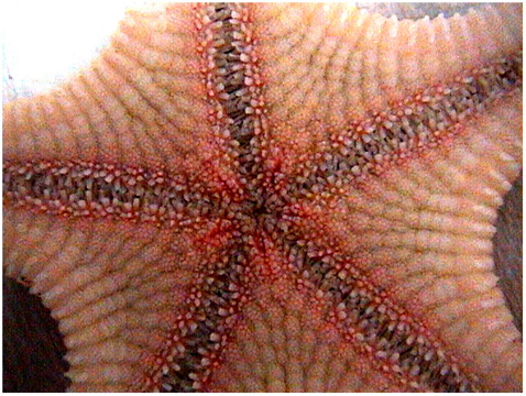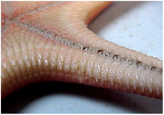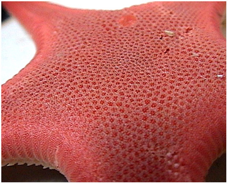 Right: The disk has paxillae with clusters of tiny pores, and the marginal plates