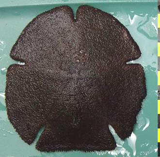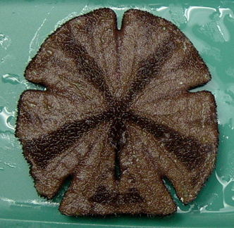 This large irregular urchin has 5 characteristic notches and only one lunule on the posterior end (lower half