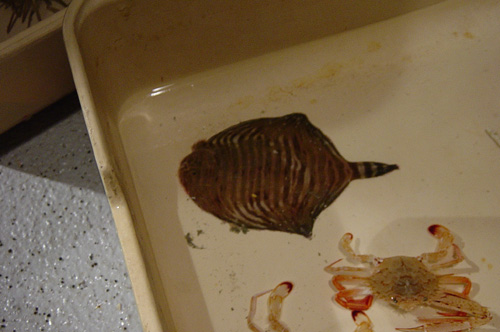 A flatfish and crab collected with the dredge