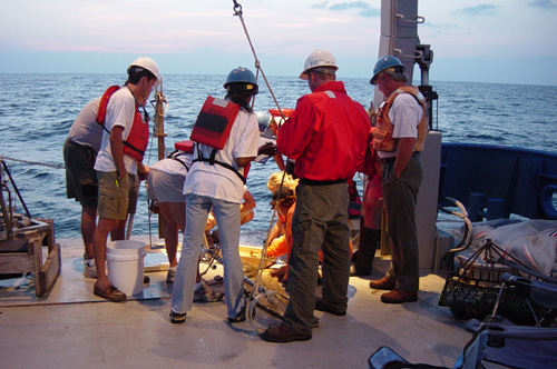 Previous | Next | Gallery (3 of 12) Students gather around to identify and count the collected specimens