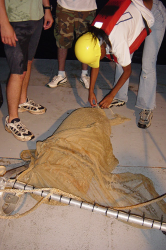 Opening the net to examine the contents
