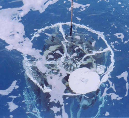 Previous | Next | Gallery (1 of 12) The CTD rosette is lowered into the water column. The white disk mounted on top is a secchi disk.
