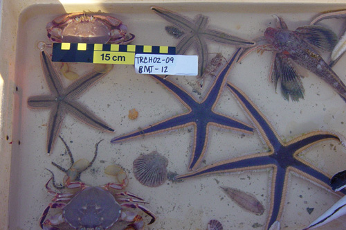 Crabs, Scallops, Shrimp, Star fish, a Sole and a Sea Robin.