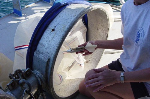 Previous | Next | Gallery (7 of 12) The flow meter measures the volume of water that passed through the nets during the tow.