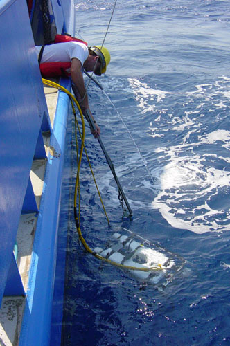 When retrieving the ROV the students use a pole with a hook on the end to grab the ROV.
