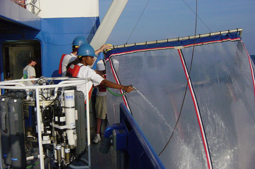 Rinsing the net after deployment.