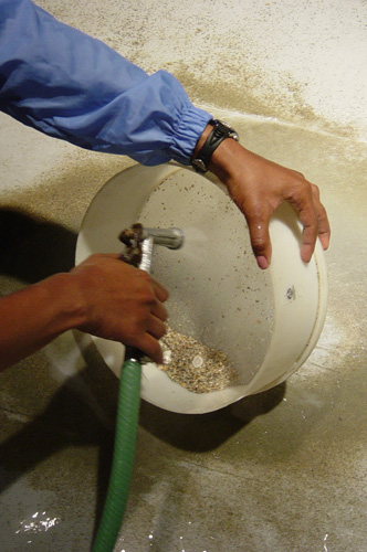 Previous | Next | Gallery (5 of 12) The sediment is rinsed through sieves to eliminate the very fine particles.