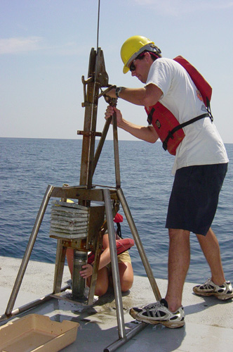 Previous | Next | Gallery (4 of 12) One person releases the core while another slides a plug into the bottom of it in order to keep the sediment in the tube.