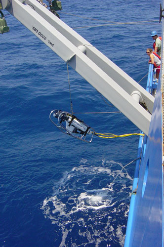 The ROV is lowered gently to the surface of the water.