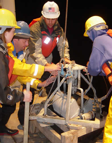 biology undergraduate student) ready the Smith-McIntyre grab sampler