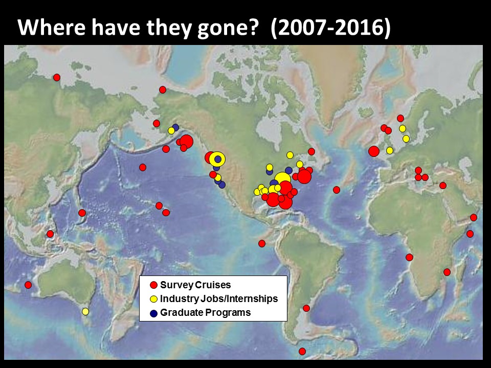 Practical at-sea experience is a cornerstone of BEAMS. Students have a unique opportunity to sail aboard a research vessel during a BEAMS-dedicated multibeam sonar survey cruise. During their time at sea, students learn the instrumentation for data collection as well as the planning and data acquisition software. They also post-process data during each survey and begin analyzing their results.