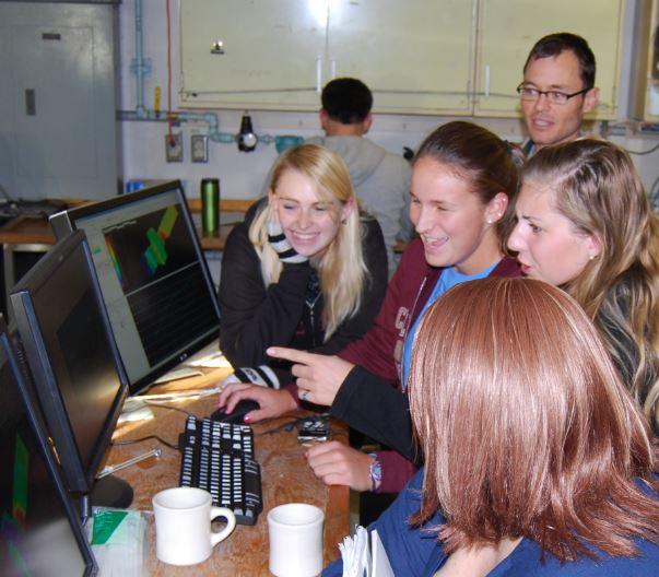 BEAMS students learn to use state-of-the-art multibeam sonar data processing software to generate bathymetric maps and acoustic backscatter imagery for seabed classification. Those who elect to reach full "BEAM TEAM" status, continue on to the research course, which offers a multi-day at-sea sonar data acquisition cruise and requires a full research project using data either from NOAA NGDC or collected during BEAMS cruises. Students present their results at regional and national meetings annually. Development of supplemental field-based courses for sidescan sonar and sub-bottom profiling, workshops for training in additional software, and plans for summer institutes are all underway.