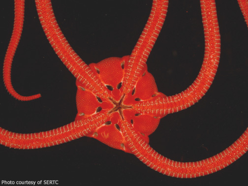 Note the four bursal slits in each interradius (between each pair of arms), characteristic of the family Ophiodermatidae.